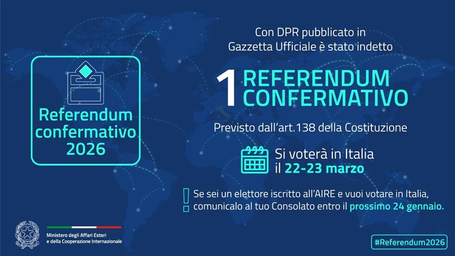 In particolare, gli elettori residenti all'estero possono esercitare il diritto di optare per il voto in Italia entro il decimo giorno successivo alla data di pubblicazione nella Gazzetta Ufficiale del decreto di indizione dei referendum. Nel caso del referendum del 22 e 23 marzo 2026, il diritto di scelta di votare in Italia deve essere dunque esercitato entro sabato 24 gennaio 2026, termine entro cui la dichiarazione dovrà pervenire all'Ufficio Consolare della circoscrizione di residenza dell'elettore (l'opzione potrà anche essere revocata con le medesime modalità entro lo stesso termine).