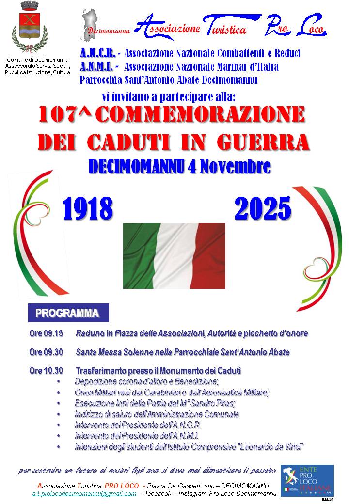 Il Comune di Decimomannu, in collaborazione con l'Associazione Turistica Pro Loco, l'Associazione Nazionale Combattenti e Reduci (A.N.C.R.),l'Associazione Nazionale Marinai D'Italia (A.N.M.I.) e la Parrocchia Sant’Antonio Abate, è lieto di invitarvi alla 107ª Commemorazione dei Caduti in Guerra.