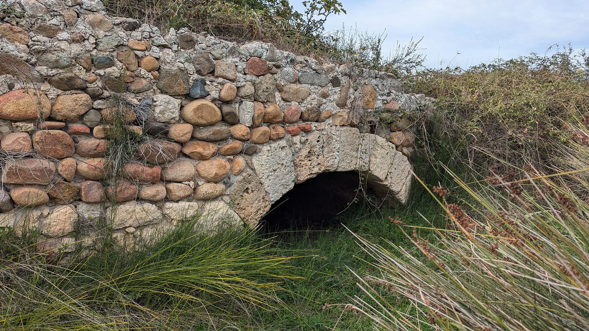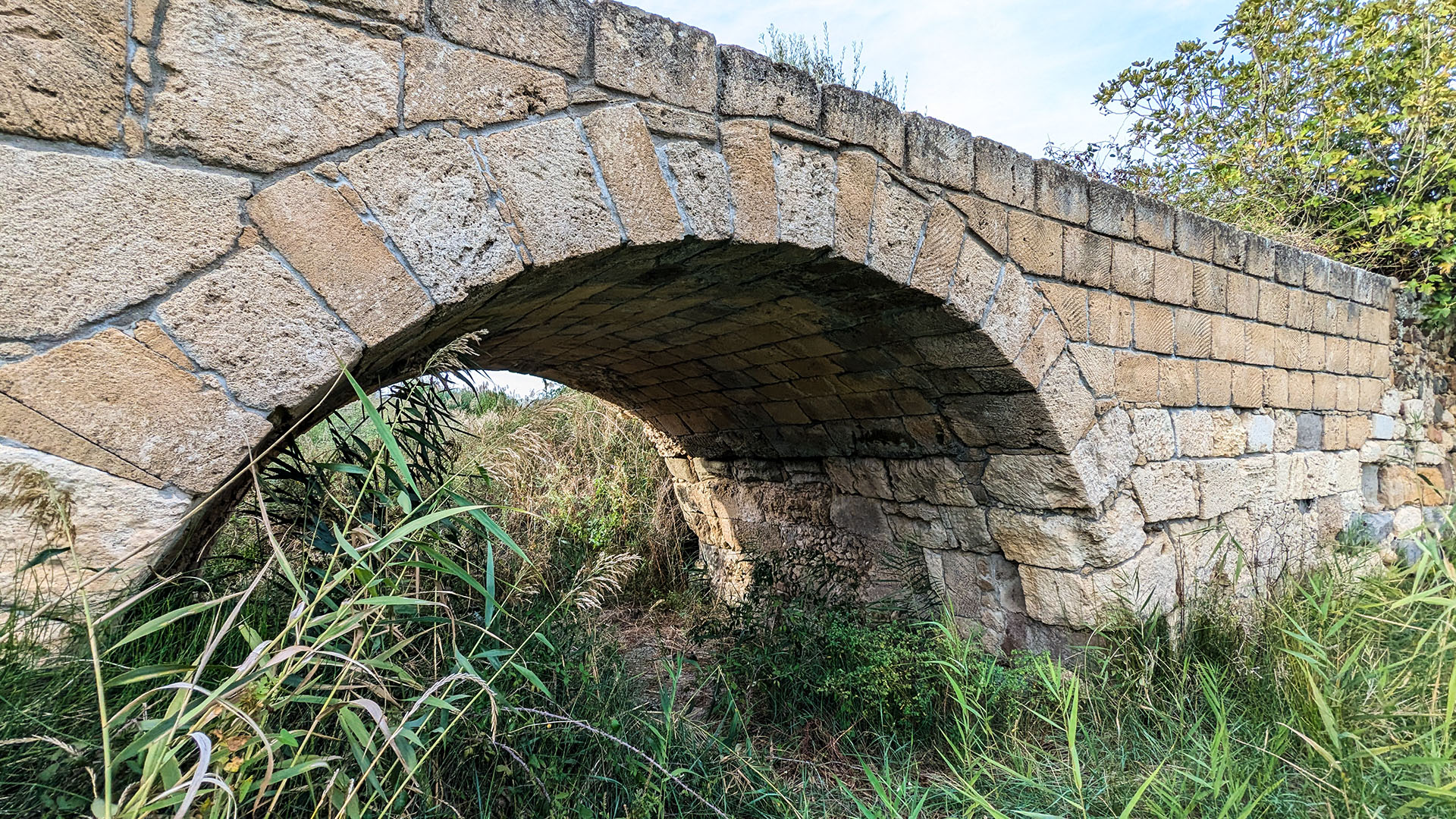 Nel lato Nord Ovest è visibile uno sperone frangiflutti, elemento utilizzato dagli ingegneri romani per diminuire la pressione esercitata dalle acque sulle strutture murarie. La carreggiata è costruita dai ciottoli fluviali pressati direttamente sul terreno. Sono ancora presenti, sotto la strada sterrata attuale che conduce al paese, denominata nelle mappe Strada Comunale del Ponte Romano, tracce dell’acciottolato antico. Questo è affiancato da un muro di delimitazione destinato a proteggere la via dalle inondazioni. Anche in questo caso sono riconoscibili due fasi edilizie: la più antica in blocchi squadrati messi in opera a secco, contemporanea alla costruzione originaria del ponte; la seconda realizzata con la stessa tecnica dei restauri, cioè con ciottoli fluviali affogati nella malta. Durante i lavori di restauro del 1995, sono stati individuati al di sotto di questo muro resti di altre murature realizzate con grossi blocchi squadrati (ora ricoperti), di non precisabile interpretazione, ma che fanno pensare ad opere viarie ed idrauliche più antiche dei resti oggi visibili. Non è possibile datare con precisione la costruzione del ponte, vista l’assenza di fonti storiche ed epigrafiche che lo riguardano. Dai confronti con strutture simili meglio databili esistenti in Sardegna, è plausibile proporre una datazione non precedente all’impero di Augusto, tra la fine del I secolo a.C. e l’inizio del I d.C.